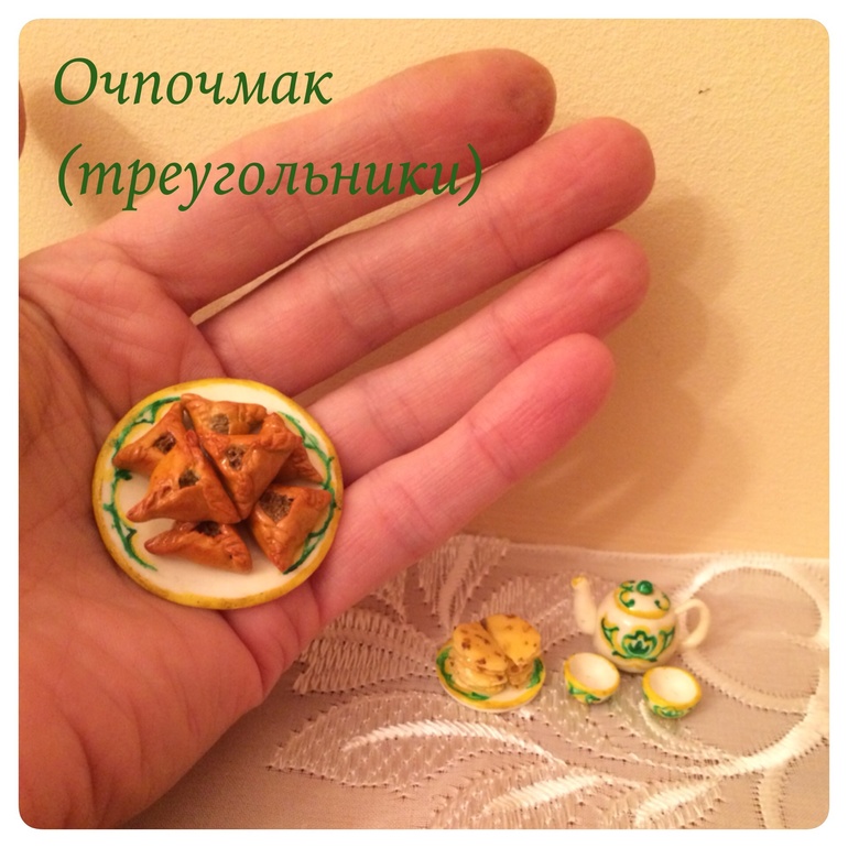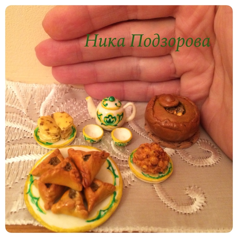 Пластика и холодный фарфорПодруга сказала: я тоже хочу миниатюруууу!!! Ну вот я и задумалась: она у меня татарочка. Решила соблюсти цвета и орнаменты, ну и конечно национальную кухню))) приглашаю оценить: