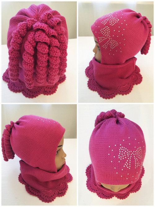 Здравствуйте, я на заказ уже не вяжу. Только то, что есть в наличии. желтенькая 52-54. Шапочка 700 руб. снуд 500 руб. орхидея (розовая) такой же размер и цена. Есть еще, как №1 в этом посте, она без снуда и вместо помпона такие же завитушки, первая фуксия в трех размерах 50-52, 52-54 и 54-56 цена такая же