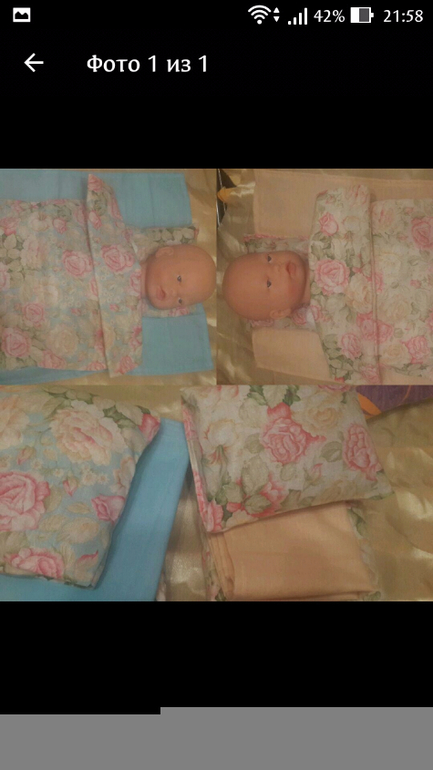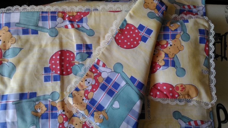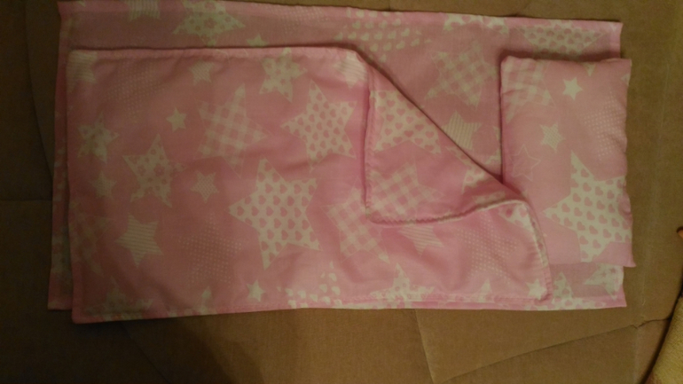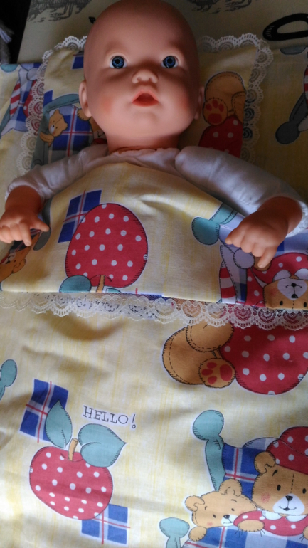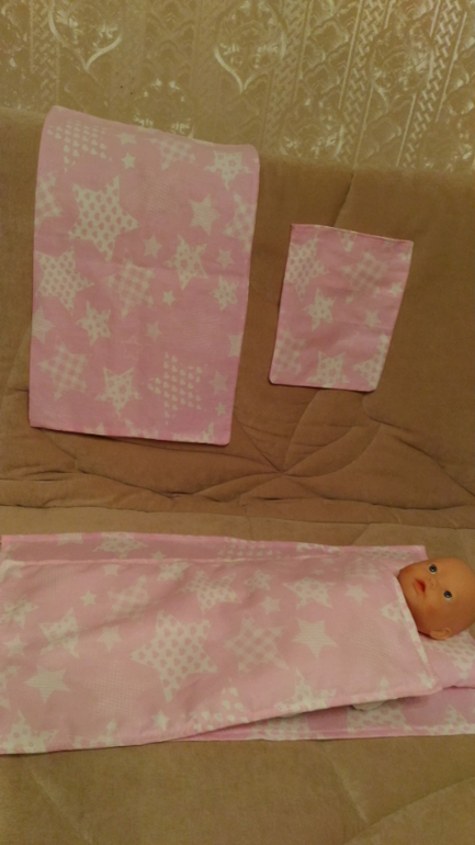 Постельное белье с пододеяльником и наволочкой или просто красивая простыня,подушка и одеяло. Красивый комплкектик сделает игру в дочки-матери незабываемой.отличный подарок.