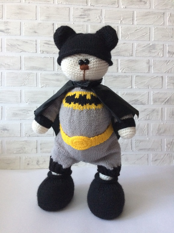 Вяжу на продажу и обменМишка бэтмен рост 42 см ждёт т своего хозяина чтоб отправится с ним в интересные приключения по спасения планеты)связан из полушерсти он всегда согреет и будет верным другом.вся одежда снимается