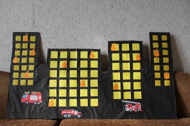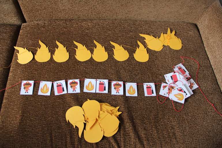 9.Украшения для интерьера огонь(10 штук), пожарный гидрант (несколько штук), огнетушитель(несколько штук), этикетки с пожарной машиной на бутылки с водой 0,5 л, картинки на пожарную тему, один конкурс(наклеить с закрытыми глазами каску пожарному), за все 100 рублей