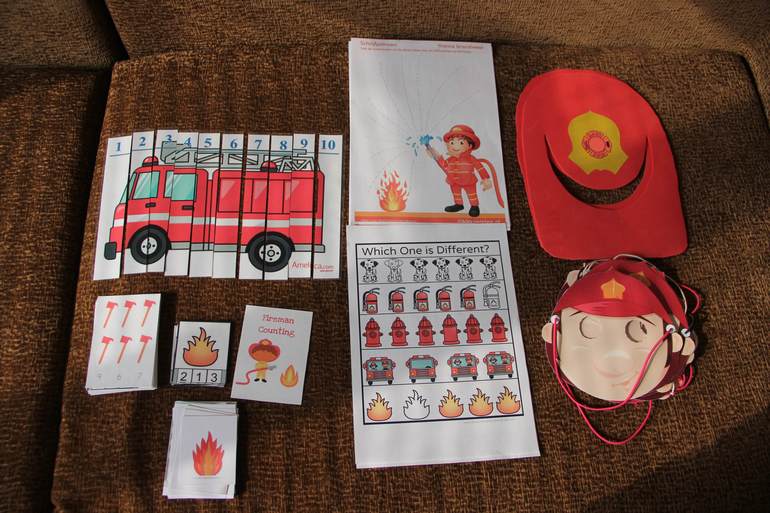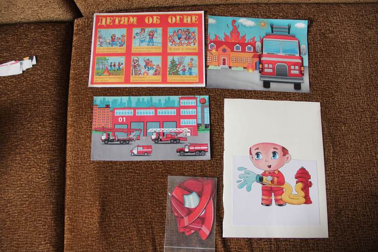 10.Разрезная картинка пазл пожарной машины, небольшие задания (около 10) на пожарную тему, маски на лицо, карточки математические,две шляпы,за все 50 рублей.