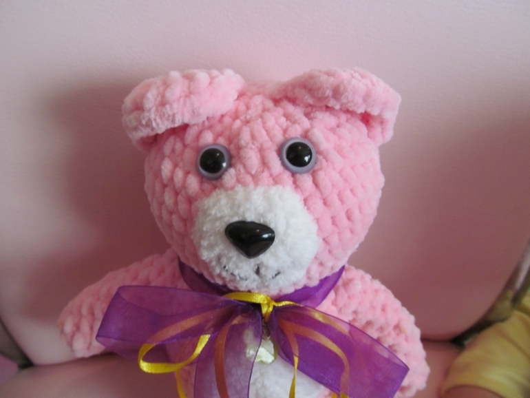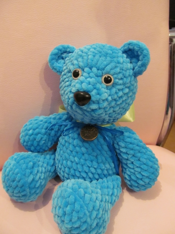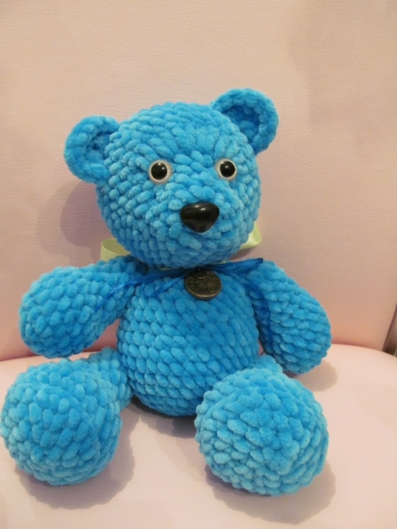 Мой плюшевый мишаня, оччень красивый цвет, ручки ножки неподвижны.связался на одном дыхании за час!