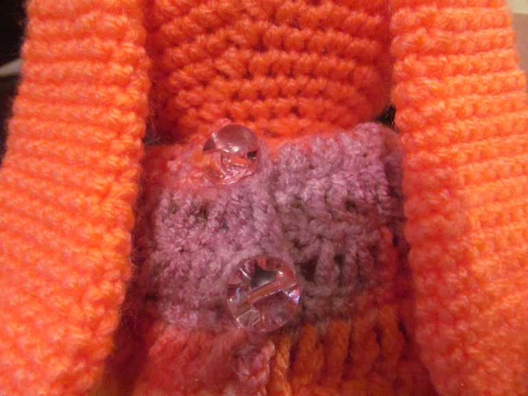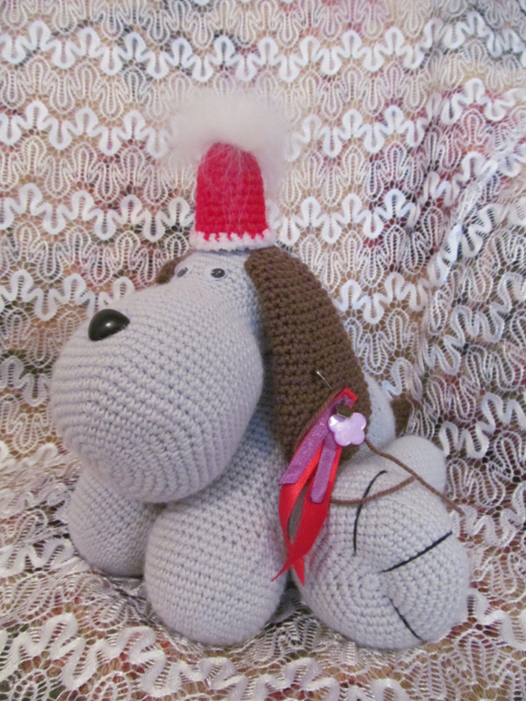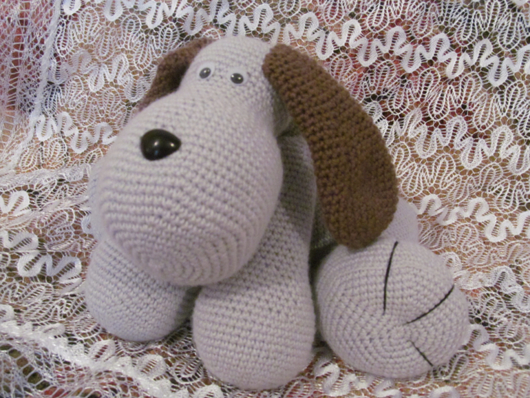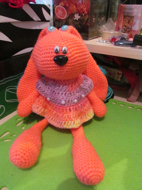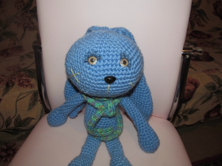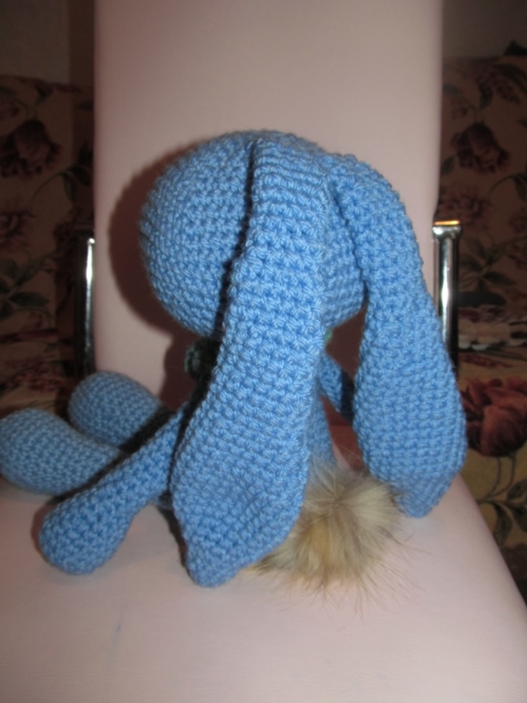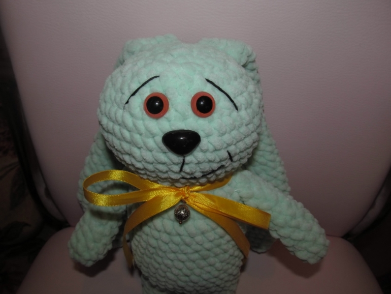 Это кареглазый толстячок, хвостик натуральный, ушиииии длиииинные!, прямо ждет своего маленького хозяина чтобы за эти ушки уже кто-то его потаскал. Он очень мягонький, теплый, чуток тяжеловатый, оччень большой! ушло на него 2,5 моточка полушерсти.