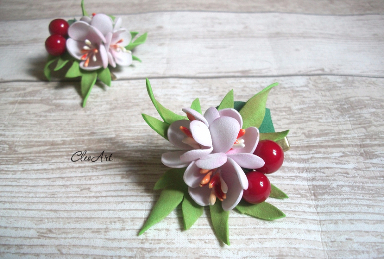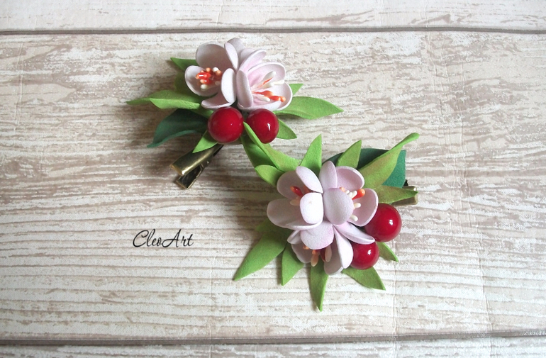 Кокетливые и милые заколочки в виде композиции из цветочков и ягод. Цветы выполнены из фоамирана, который не боится влаги, не выцветает и не деформируется. Основа украшения металлический зажим "крокодил" длиной 5 см.