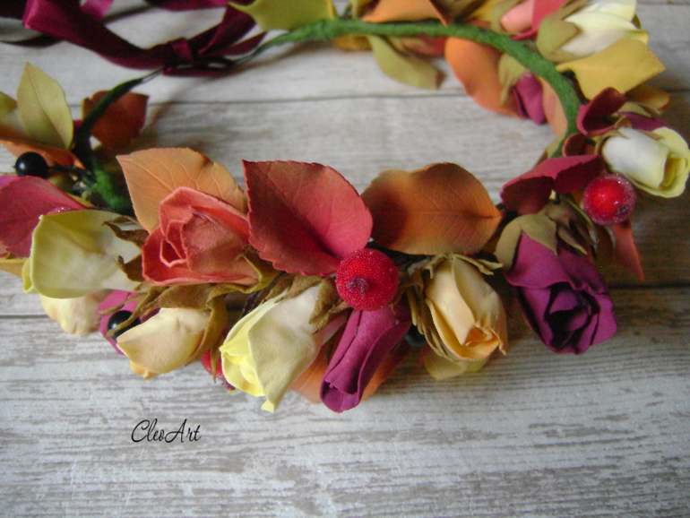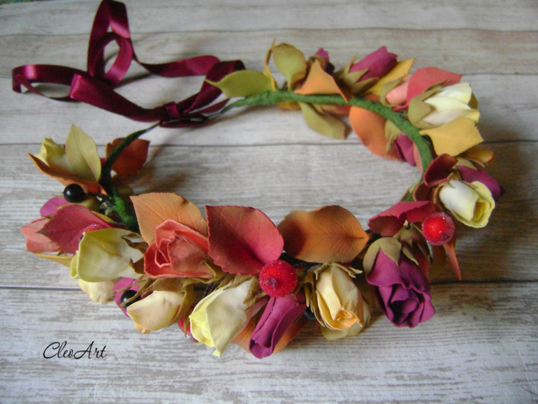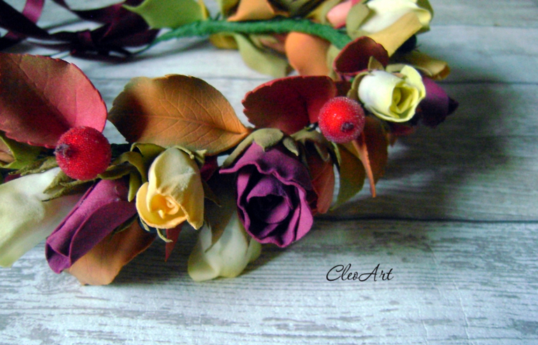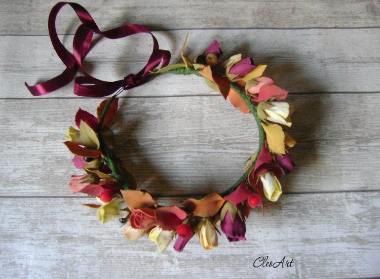 Бижутерия, броши, аксессуары для волосЯркий и очень атмосферный венок для волос вобрал в себя все краски золотой осени. Такой аксессуар позволит своей обладательнице создать неповторимый, романтичный и поэтичный образ. Размер регулируется лентой.