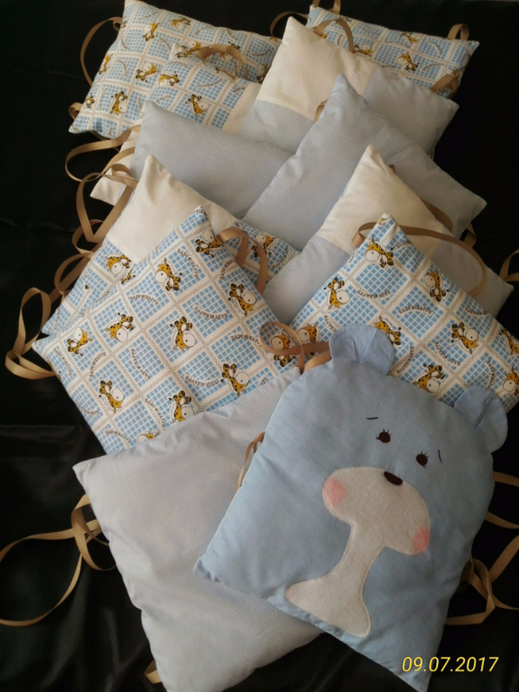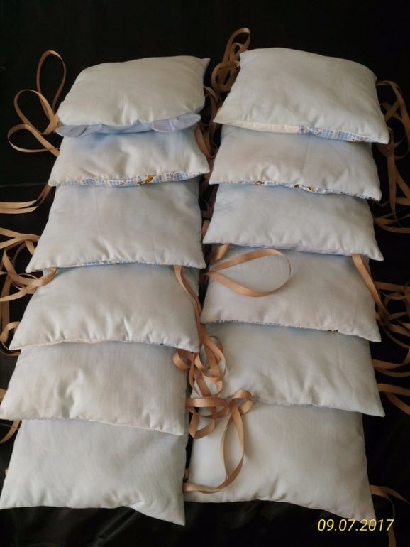 Текстиль для дома (шторы, постельное белье и т.д.)Готовые бортики в детскую кроватку для мальчика. Размер 28*28 см. Всего 12 штук. Материал -хлопок. Внутри-качественный мягкий синтепух. Привязываются на репсовые ленты (не скользят). С обратной стороны все одного цвета-голубые. Возможна бережная стирка или в машинке при температуре 30 градусов. Возможен пошив по вашим размерам и пожеланиям, съемные чехлы на молнии, матрасики, одеяло, простыни в одном стиле. Расцветка и дизайн согласовываются. Стоимость работ расчитывается индивидуально в зависимости от сложности и себестоимости материалов.