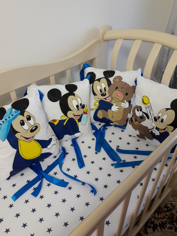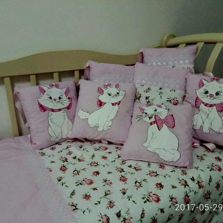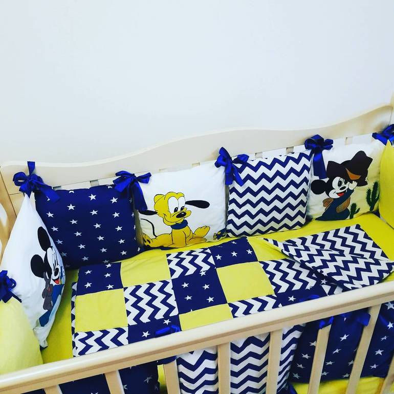 Здравствуйте)есть инстаграм happiness_inside__. Рисунки монут быть любые, ткань Польша ( не линяет при стирке), стоимость комплекта 7т.р ( 12 подушечек, простынь на резинке, одеяло( синтепон; можно даже как конверт на выписку сделать))