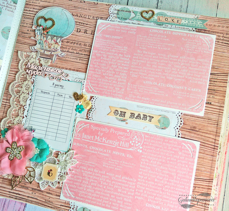 Альбом вмещает в себя около 80-90 фото 10х15см, несколько маленьких и круглых фото, 3 больших кармана для табличек и доп. фото. Также имеются кармашки и на страницах для карточек, бирочки из роддома и т.п. Все материалы архивного качества..