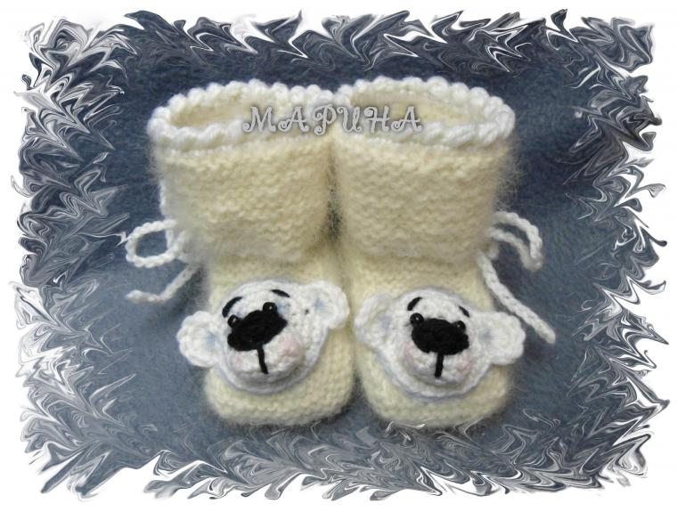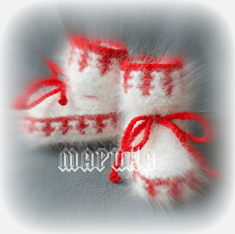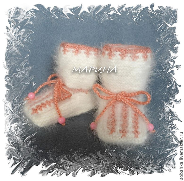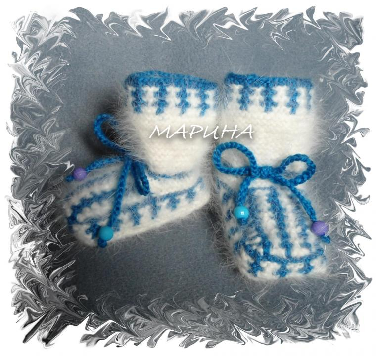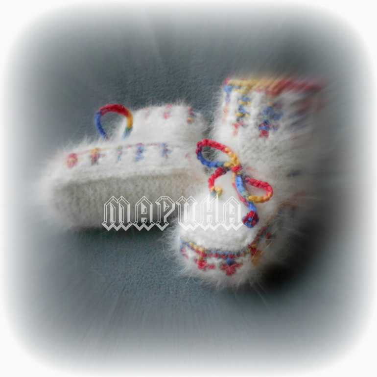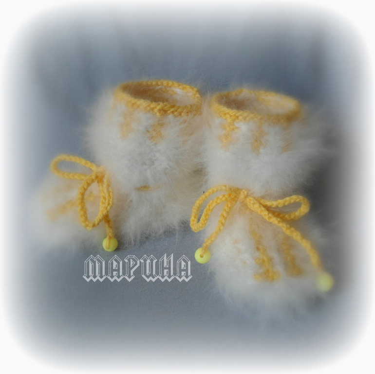 пинетки выпоненны из кроличьего пуха. пушистые и лёёёгкие. очень тёплые. кроличий пух не колется и не раздражает кожу малыша.