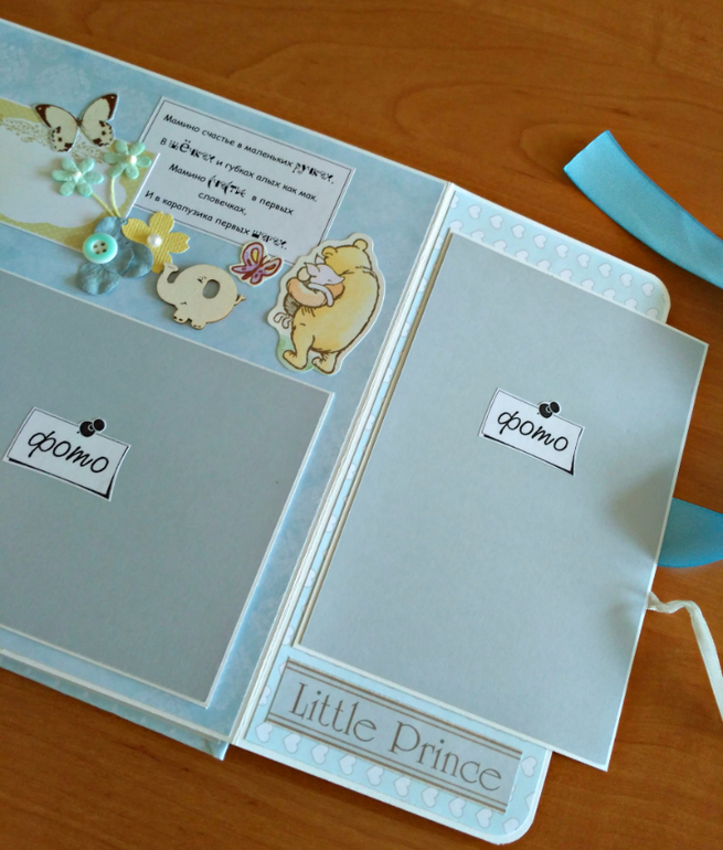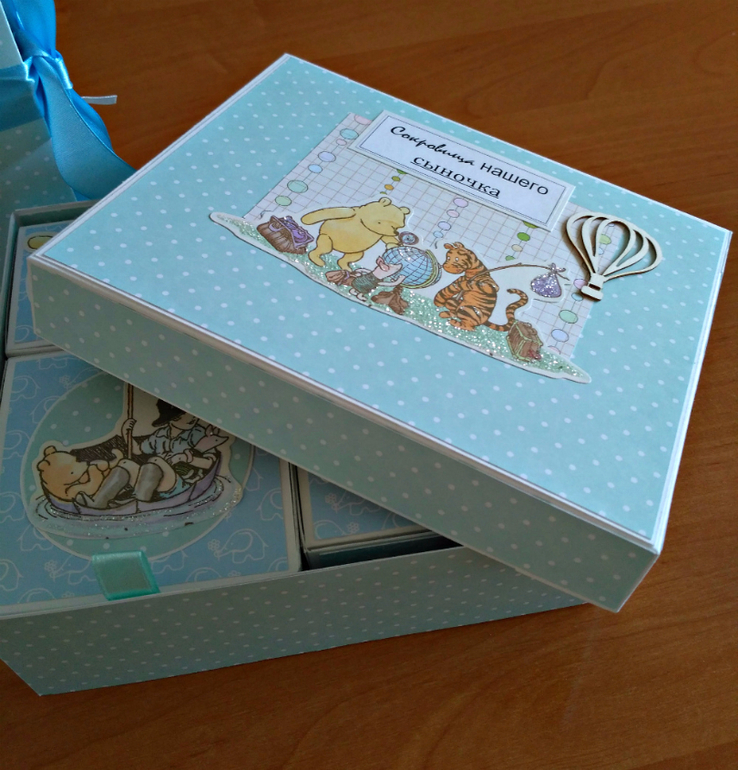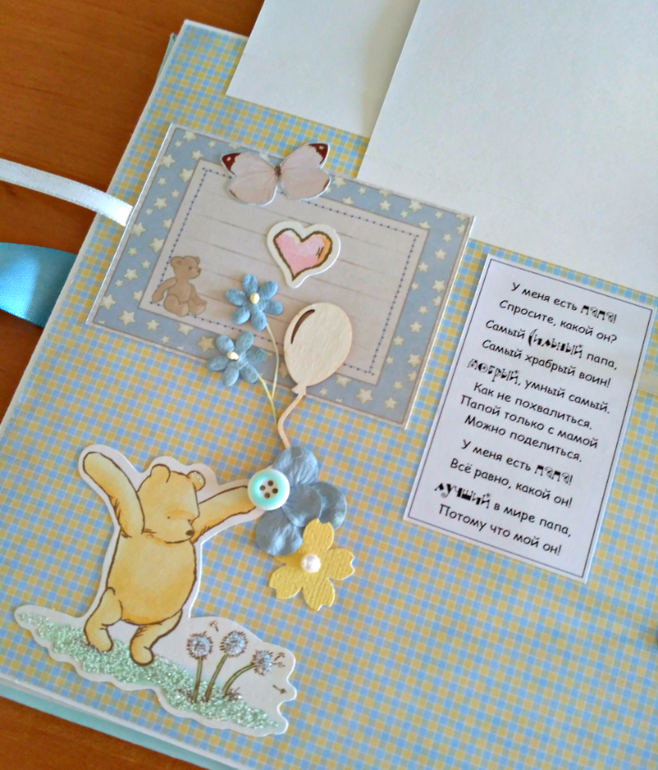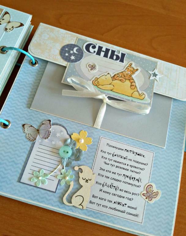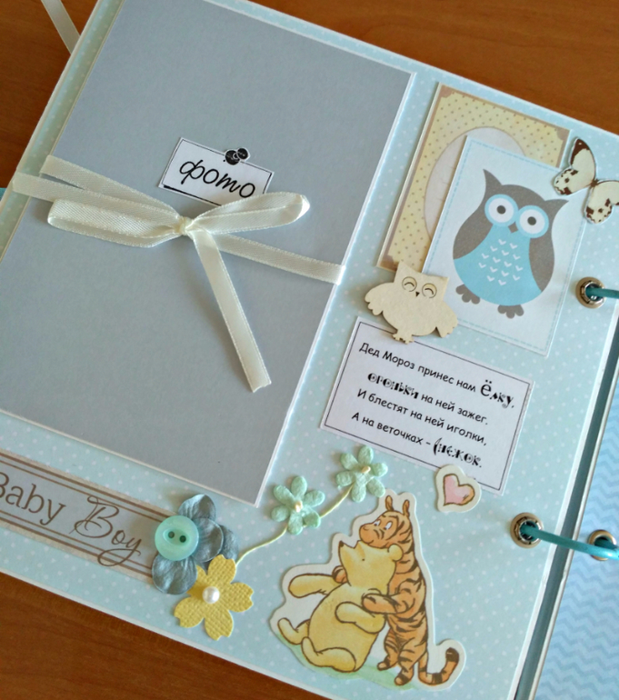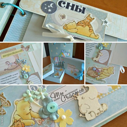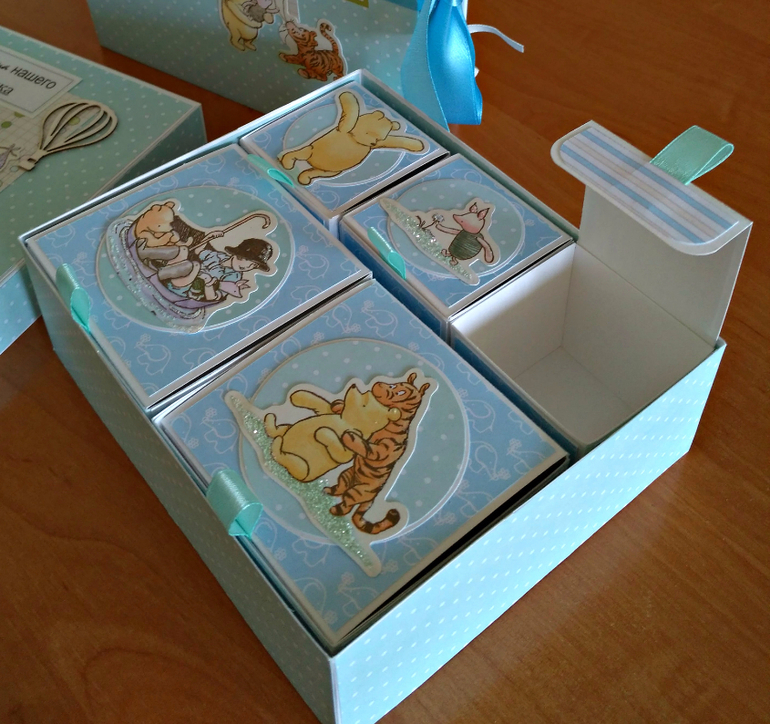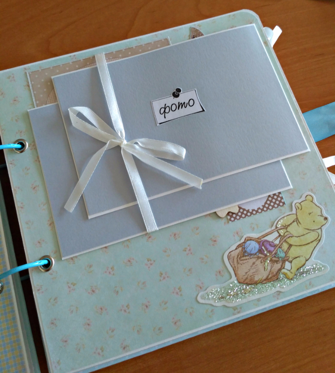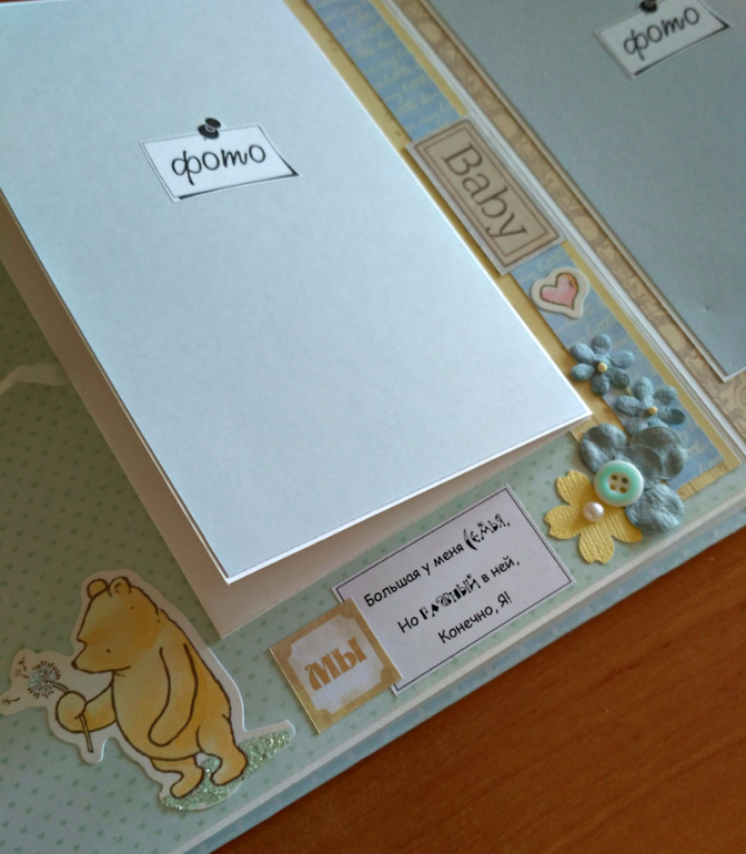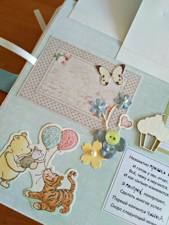 Скрапбукинг (альбомы, открытки и пр.)Всем привет) Вот такой очаровательный набор для малыша на первый годик с Винни Пухом, вмещает около 60 фото. Есть секретные развороты, кармашки и много интересных деталек. Коробочка для вещей малыша в той же цветовой гамме и стиле, что и альбом. Внимание, под катом очень много фото!!!