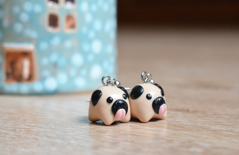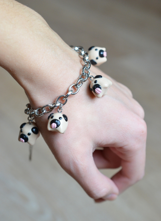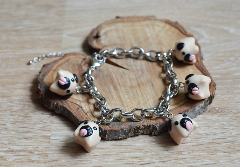 Браслет и серьги с подвесками мопсиками из полимерной глины