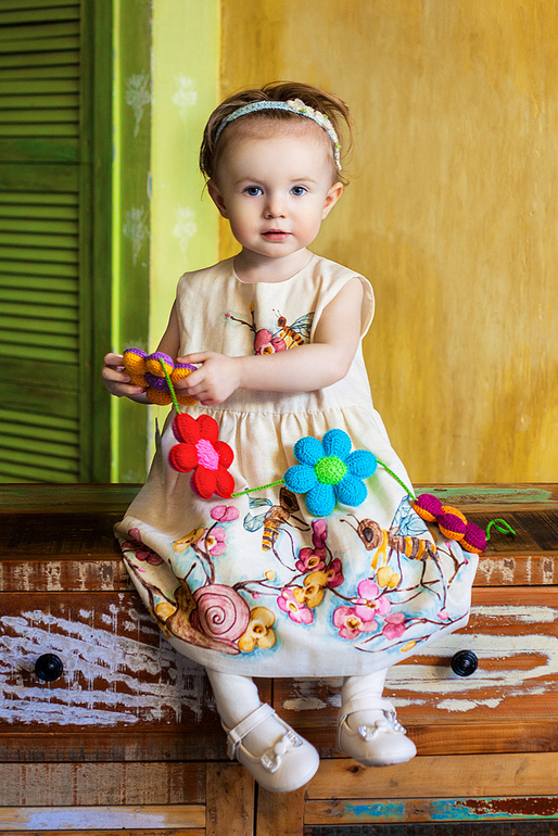 Батик, ручная роспись по тканиПлатье из 100% льна - коллекция «Я люблю мед». Веселые мордашки, пчелки и цветочки - настоящее веселье для детства .