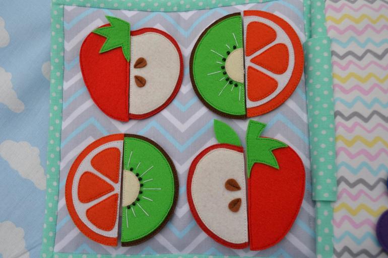 Нежная снаружи, яркая, сочная и ''хрустящая'' внутри)) Выполнена из 100% хлопка, качественного корейского фетра, а так же бусинок, пуговиц, шнурков и пр. Огромное количество съемных деталей привлечет внимание любого непоседы. В игровой форме мы знакомим его с основными геометрическими фигурами, цветами, учим их сопоставлять, тем самым побуждая ребенка к мышлению, развитию речи. Сумочка в комплекте с книжкой, так ее удобно беречь и брать с собой в поездки.