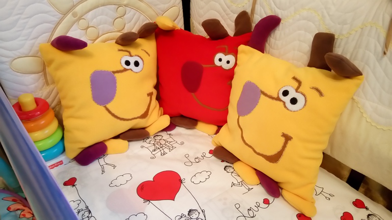 Делаю псов на заказ! Непосредственно этих - заказывали как подушки для машины , некоторые заказывают как бортики для детской кроватки. Цена пса - 600 рублей)) Размер 33х33 см. Расцветки и ткань - можно подобрать на любой вкус)) Забавные мордахи всегда будут поднимать Вам настроение))