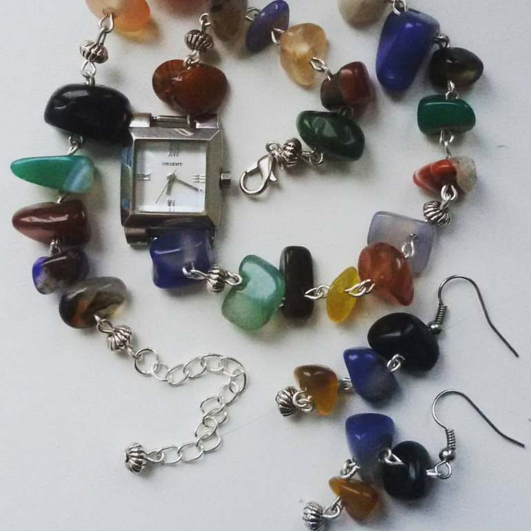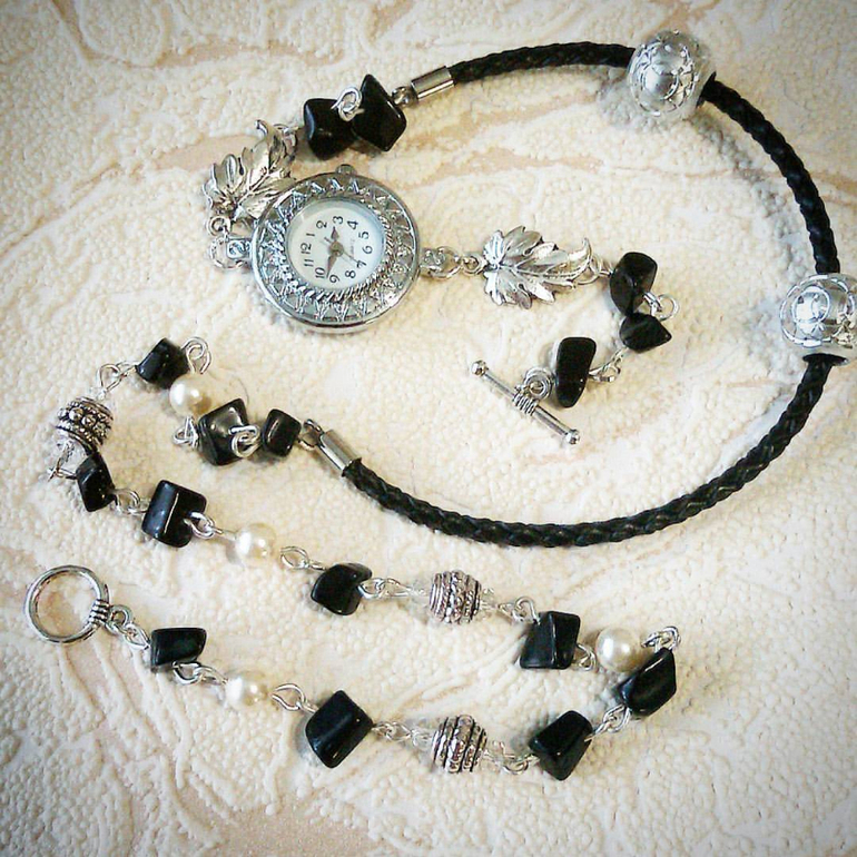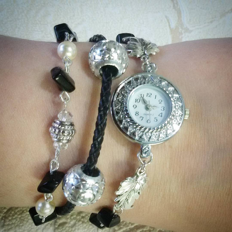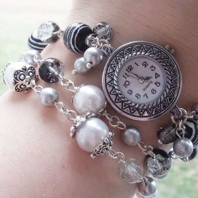 Бижутерия, броши, аксессуары для волосМоя любимая "фишка" - часы-намотыши. Стандарт - 3 обхвата руки, в голубом цвете разошлись на "ура" и под заказ, в черно-белом цвете тоже очень востребовано. На заказ можем сделать любого цвета и самыми разными бусинами - и натуральный камень, и чешское стекло, и акрил.