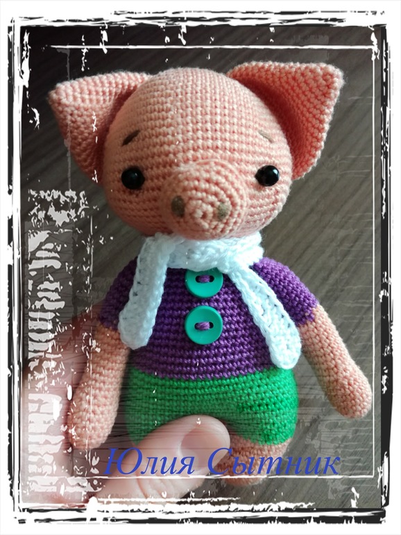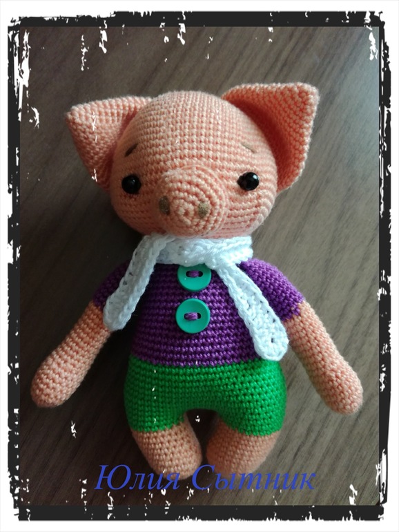 Озорной поросёночек ростом всего 14 см, связан из хлопковых ниточек, безопасные глазки, шарфик снимается.
