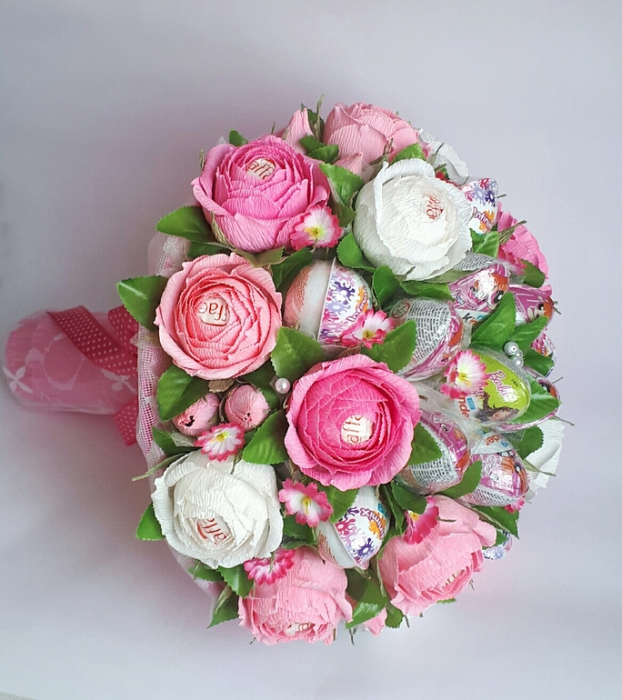 Диаметр 33 см. Состав: яйца Kinder surprise 7 шт, Kinder Joy 5 шт., конфеты Raffaello 150гр ( коробка). Цена 2600. На заказ