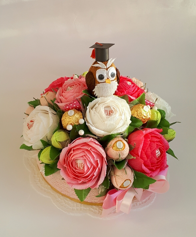 Диаметр 26 см, конфеты : Ferrero rocher 9 шт, Raffaello 9 шт, яйцо Kinder surprise 1 шт, Трюфель оригинальный 9 шт. Цена 1500. Бесплатная доставка до любой станции метро. В наличии бюд
