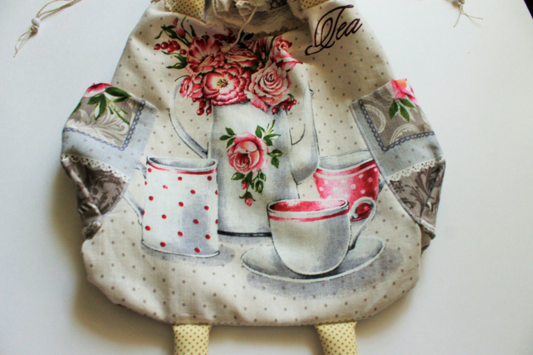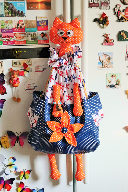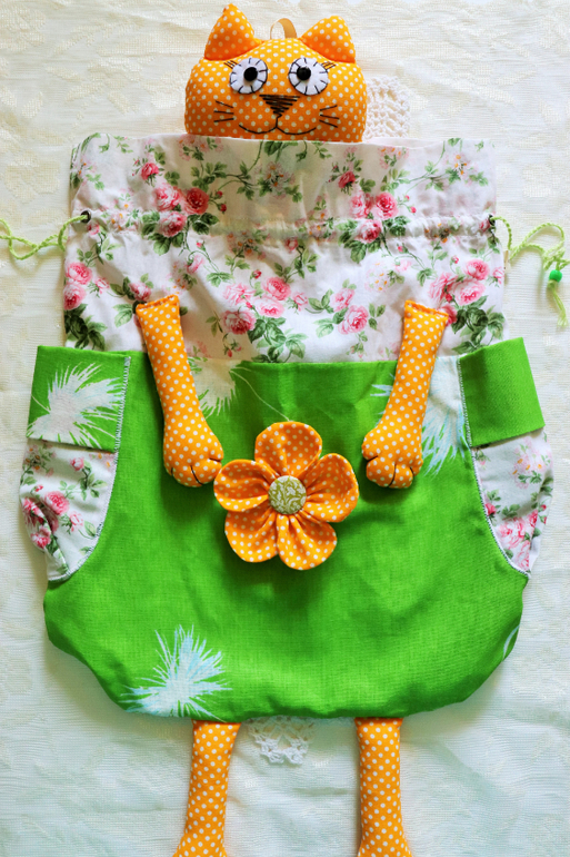По бокам располагаются объемные кармашки для пакетов в рулончиках. Мешочек выполнен из хлопковой ткани, украшен цветком ручной работы, горловина на шнурках ручной работы - надо потянуть в разные стороны и пакетница закрыта!