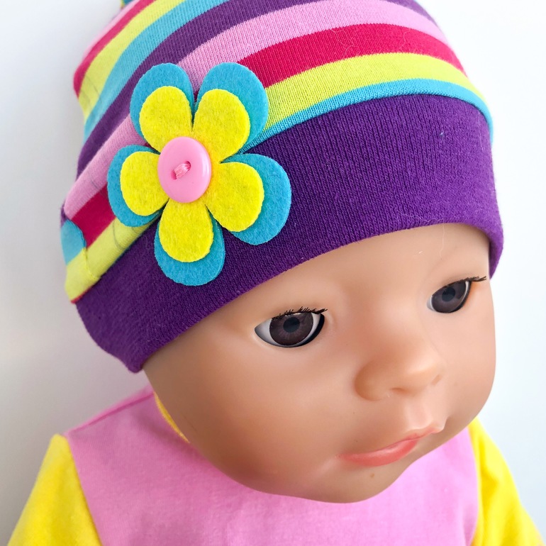 А шапочка декорирована ярким цветком из фетра.