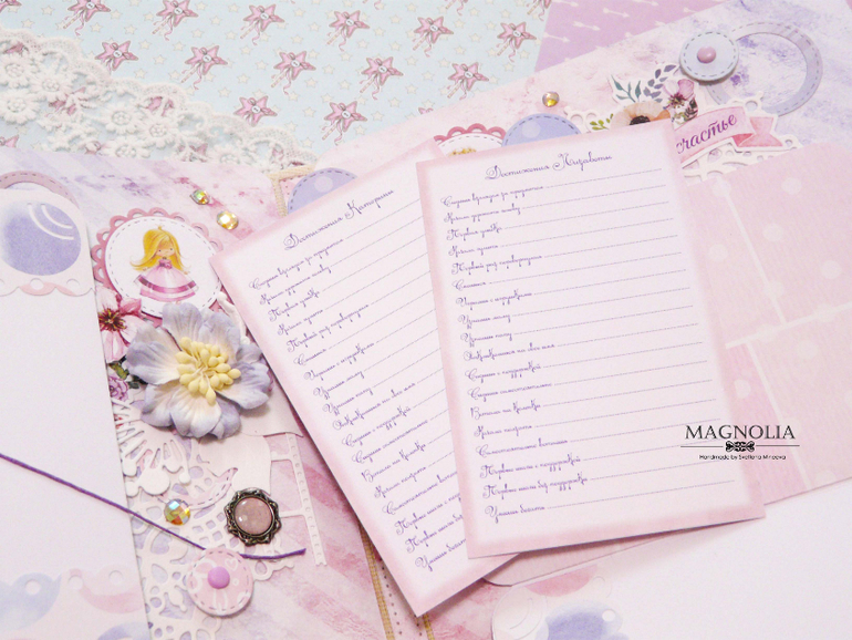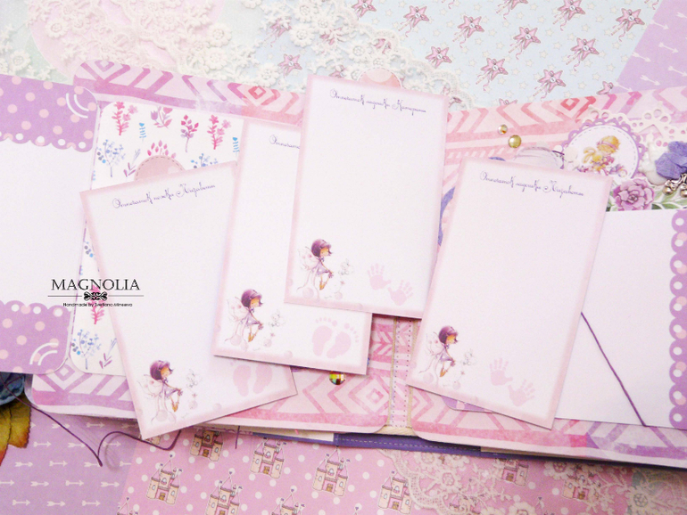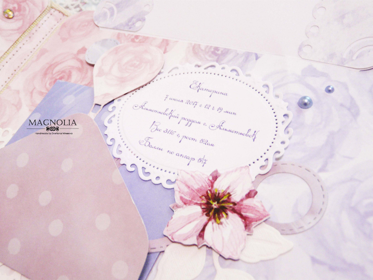 Еще в альбоме есть карман для фото узи, карман для бирки, локонов, поле для пожеланий от мамы и папы, карточки для записи графика роста, отметки роста зубов, записи достижений, обводки ножек и ладошек. И все карточки сделаны в двух экземплярах, для каждой девочки отдельно.