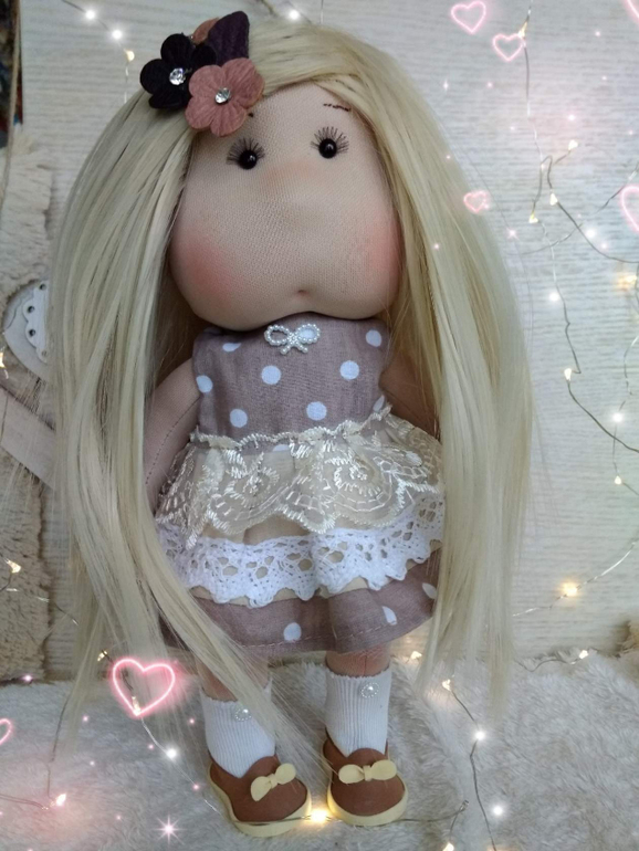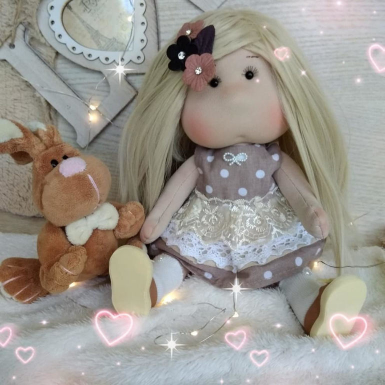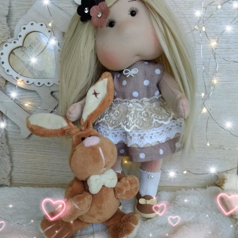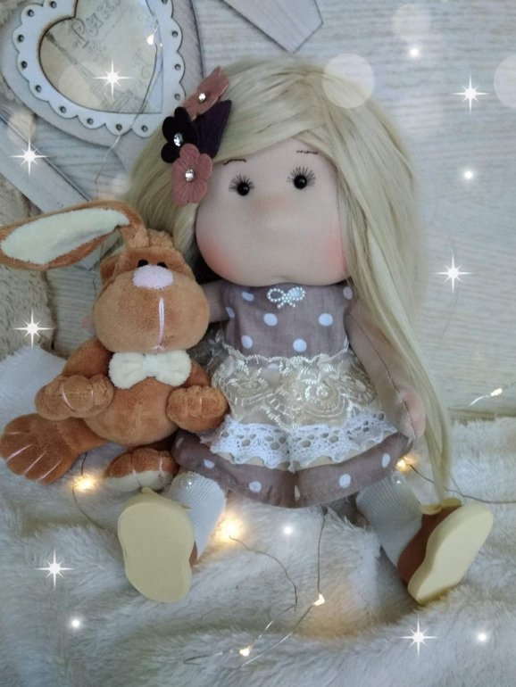 Кукла с другом Зайцем,28 см. Одежа вся снимается.Самостоятельно стоит и сидит.Ручки.ножки и голова подвижные.Из пышных волос можно делать различные причёски