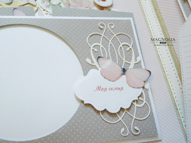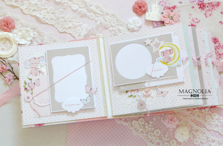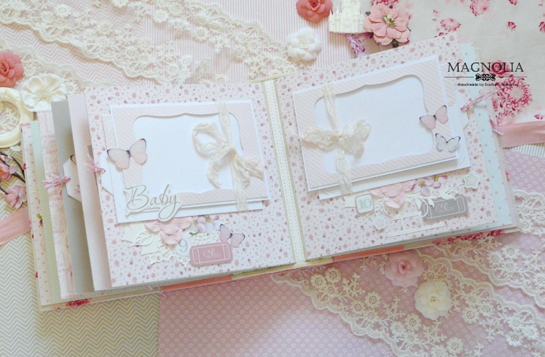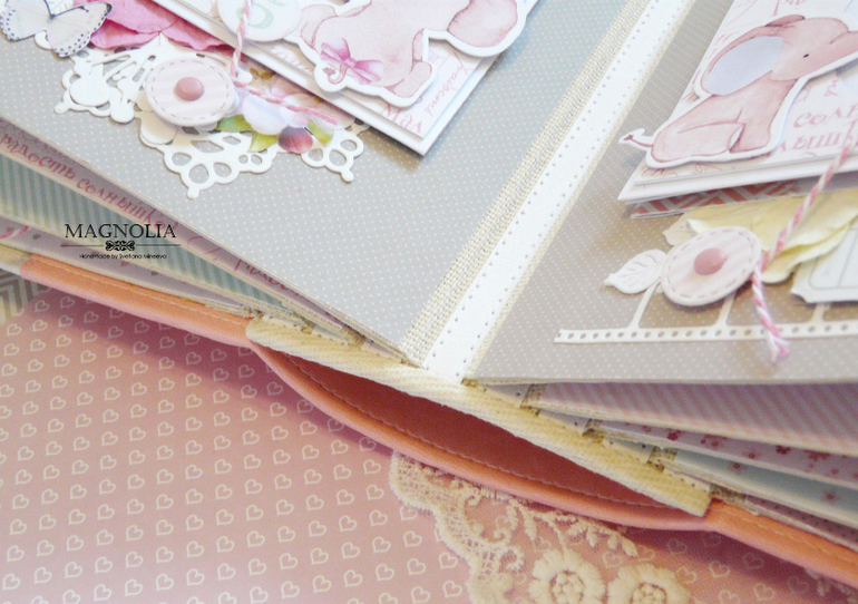 В основе альбома объемным тканевый прошитый переплет и декор всех страниц.