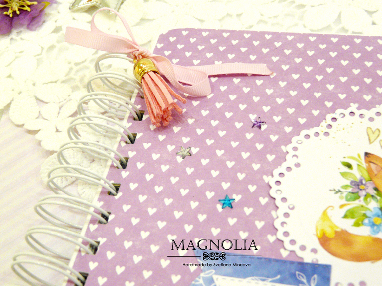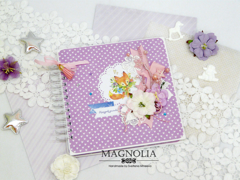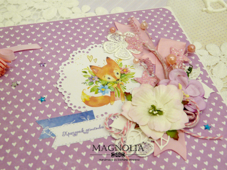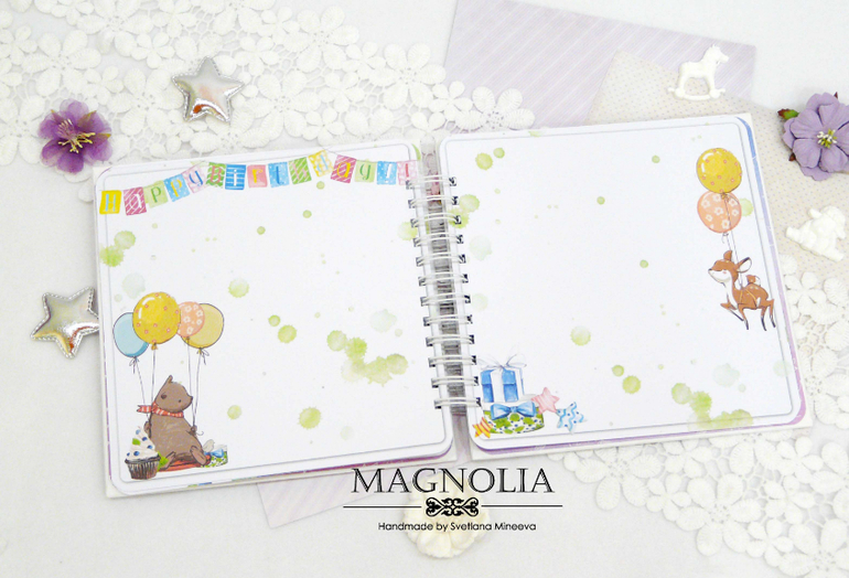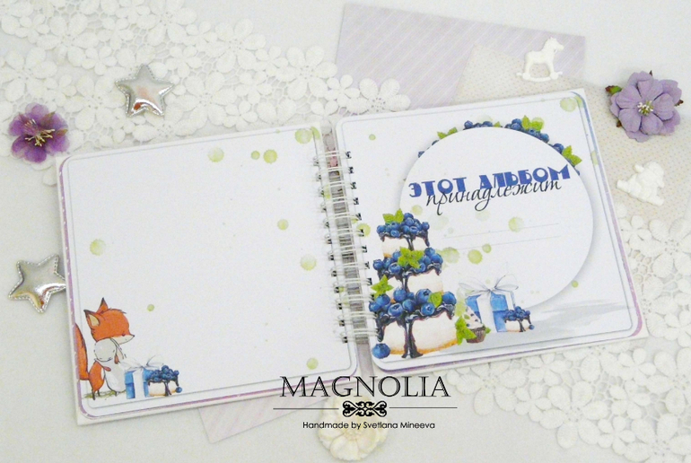 Формат работы 20*20 см, внутри плотные листы бумаги (250 гр) с яркими цветными иллюстрациями зверят, шаров и тортика, а на обложке рыжий лисенок, объемные цветы и звездочки с блестками. Крепится конструкция на пружину, которая украшена подвеской кисточкой