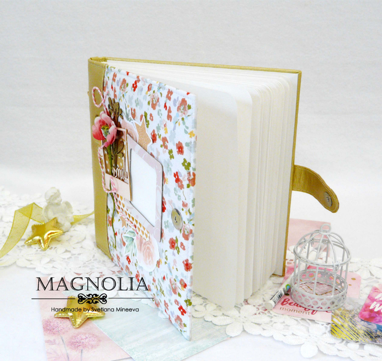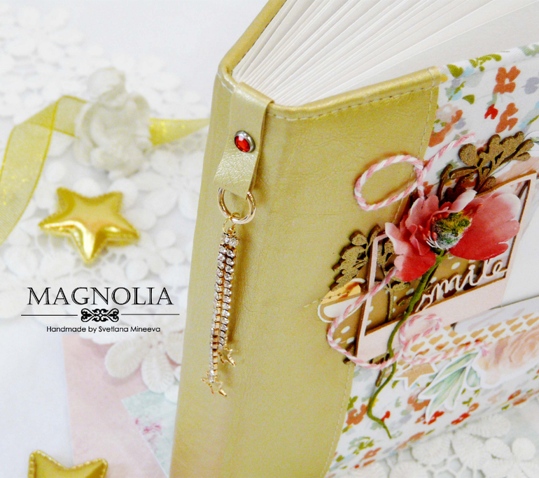 Застежка на магните, а обложка украшена объемны декором, даже рамочка для вставки фото есть. на корешке красуется сверкающая подвеска висюлька