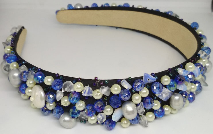 1. Ободок, вышитый бусинами, бисером, кварцем с имитацией лунного камня с добавлением серого жемчуга и жемчуга в виде таблетки. 1200 р