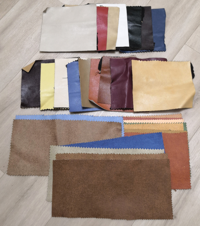 7. Мебельные "отрезы" - искусственная кожа 16 обрезов 15*17 см разных цветов; и 13 обрезов обивочного материала (не помню, к сожалению, как называется а-ля кожа с бархатистой поверхностью) размером 14*30 см. = 300 руб за все.