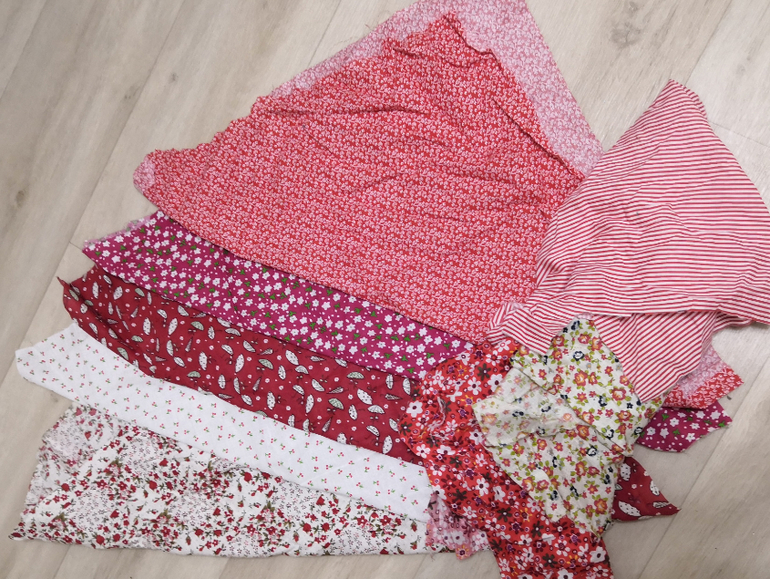 4. Отрезы ткани в красной гамме, расцветок. Большая часть - 50*50 см, пара видов меньшего размера (уточню по запросу) = 250 руб. все вместе.