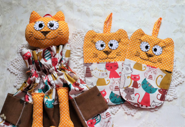 Хрюня - помощница хозяюшки замечательная))) Кошечки у тебя на любой вкус - интересно смотрится чёрная, уверена такие кошечки непременно приносят удачу в дом :) Комплект с прихваточками шикарный!!! глазками киска подмигивает))
