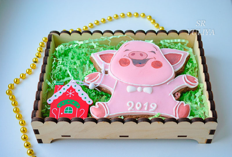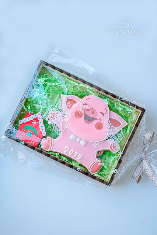 Набор, состоящий из вкуснейшего имбирного пряника, разработанного по индивидуальному авторскому эскизу, в форме забавного поросёнка, символа 2019г,. и декоративной подвески.