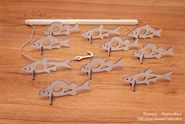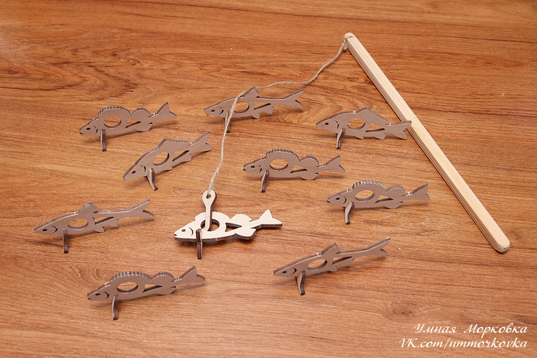 Развивающие игрушки и слингоаксессуарыРазвивающая игра для детей 2+ на развитие координации движений. Ребенок держит удочку и пытается крючком поймать рыбку. Комплект включает в себя пенал, удочку, 12 рыбок, 3 запасных крючка и 1 запасной плавник. Изготавливается из 3мм фанеры.