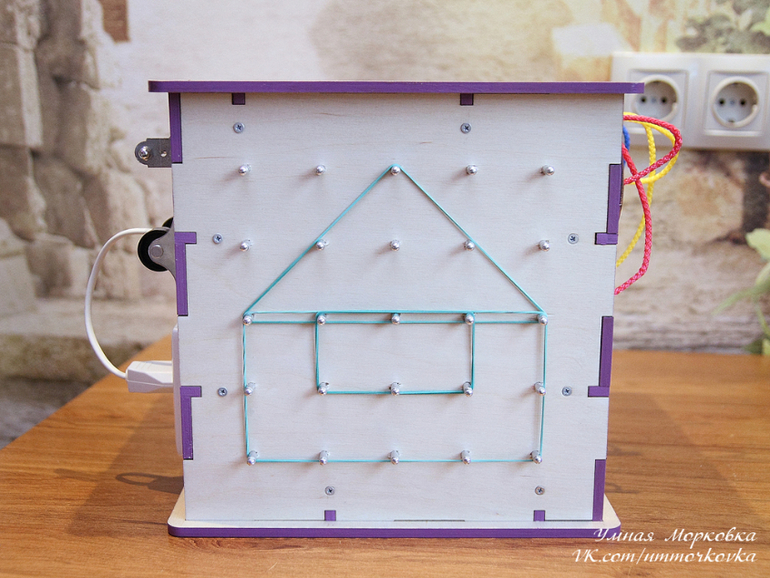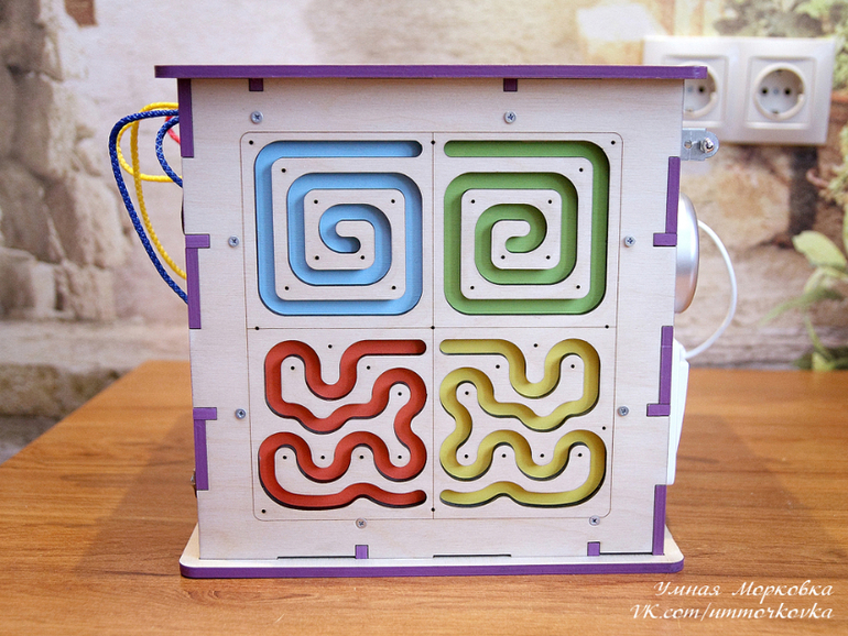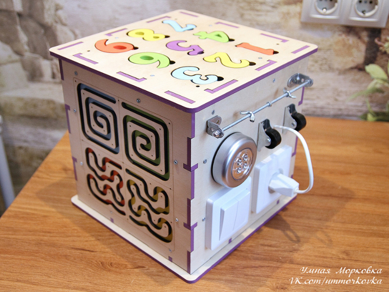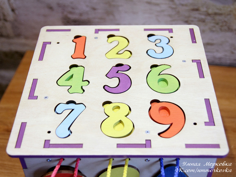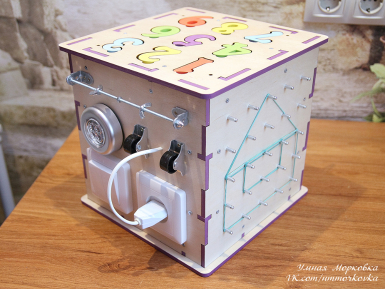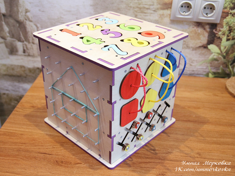 Представляю готовый бизикуб со сменными сторонами. Данная комплектация универсальна. Она рассчитана на возраст от 2 до 4-5 лет. Для ребенка возраста 1,5-2 лет будут интересны стороны с выключателями и вкладными фигурами. Крышка будет пользоваться спросом только с точки зрения вытащить и разбросать цифры. Стороны с геобордом, межполушарными лабиринтами и крышка с цифрами станут интересными ближе к 3-4 годам.