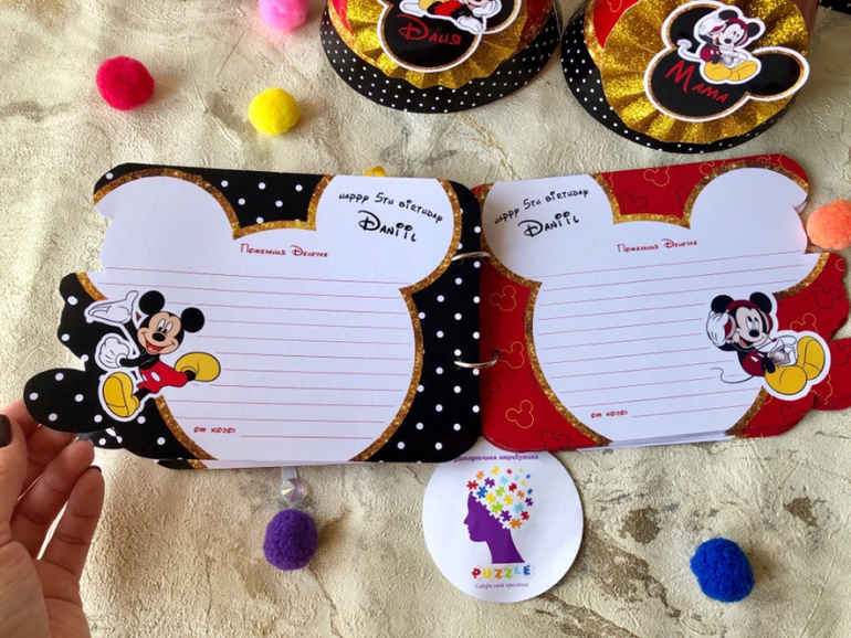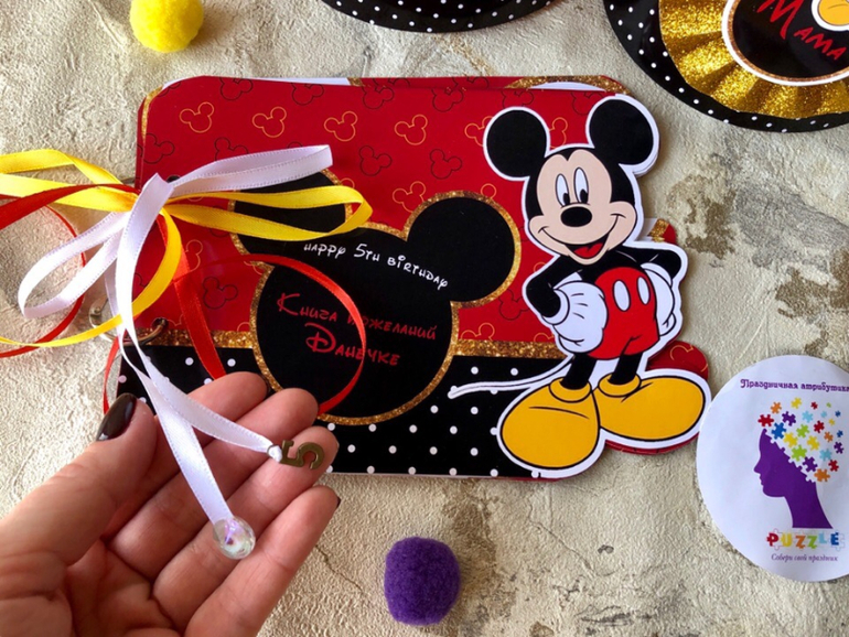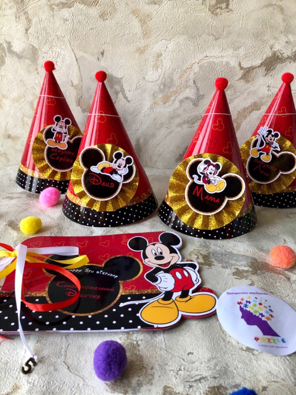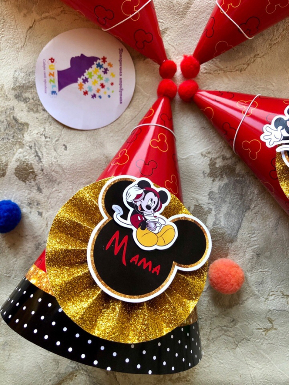 Оформление праздников, аксессуары для фотосессийОчень красивый наборчик в стиле Микки Мауса с добавлением золотых элементов. Колпаки декорированы золотыми глитерными веерными кругами.