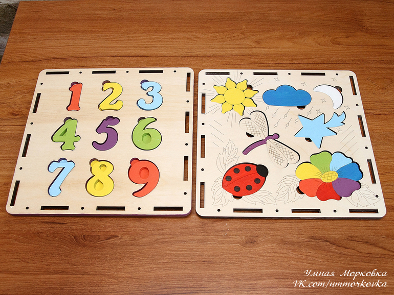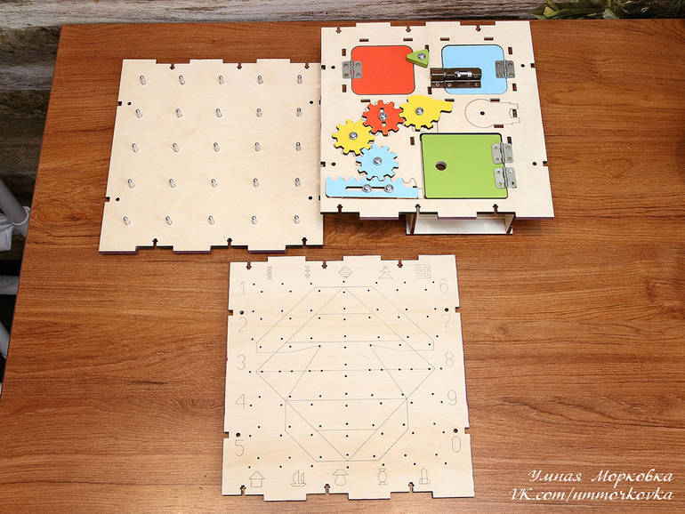 Крышка бизикуба. Имеет 7 съемных фигур. Ориентирована на развитие соотношения форм и размеров.