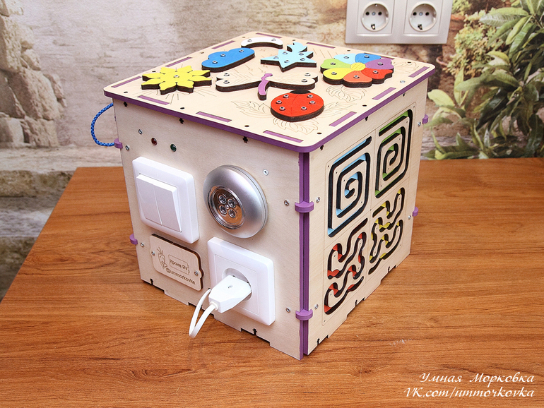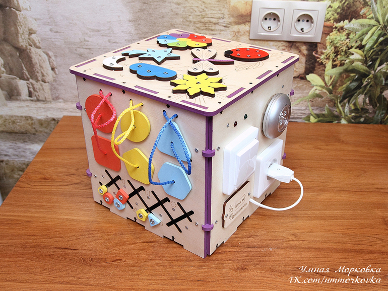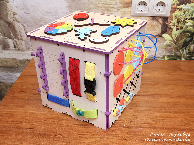 2. Старайтесь не располагать бизикуб среди мягких игрушек, где ребенок может оступиться и упасть. Бизикуб все же из фанеры и имеет твердые поверхности.