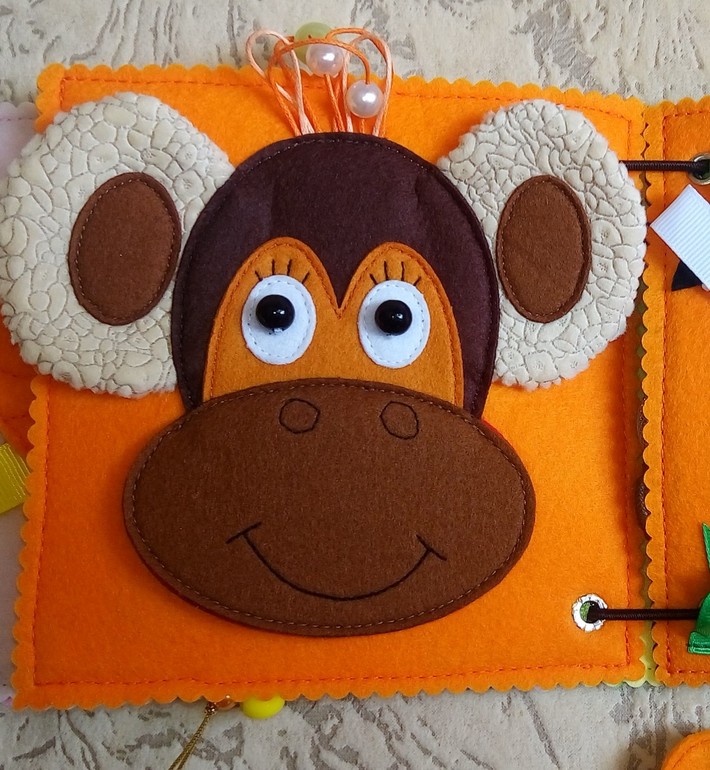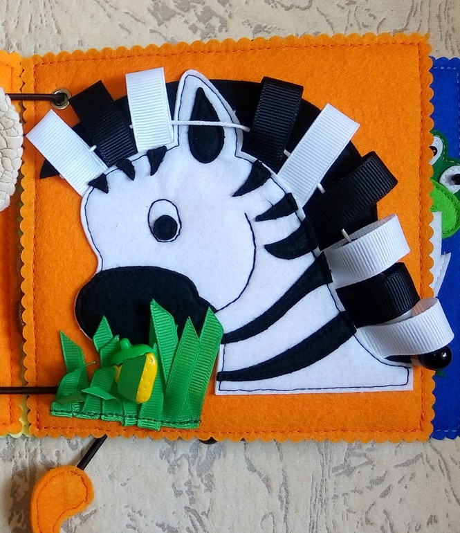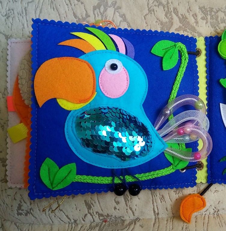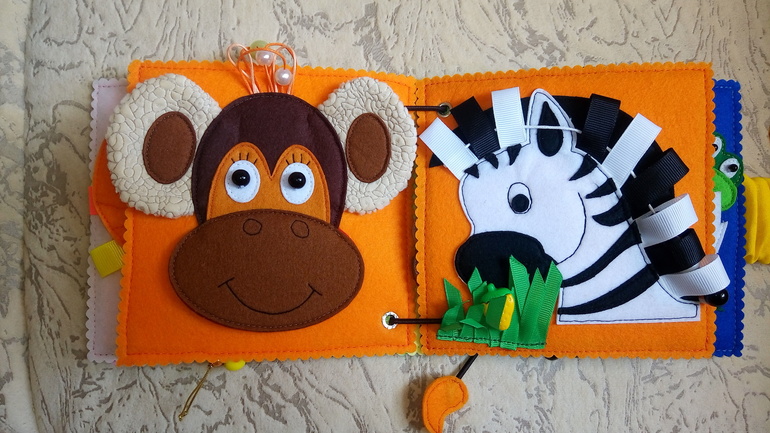 У обезьянки шуршат ушки, можно также играть в ку-ку, можно покормить бананом У зебры перебираем бусинки в гриве.в попугай вшита гремелка. Крыло- двухсторонние пайетки. В хвостике перебираем бусинки. Можно покормить апельсином.