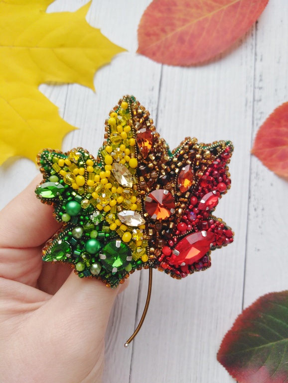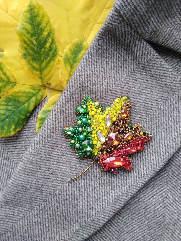 Пристраиваю брошь "Кленовый лист". Очень яркая и фактурная брошь, отличный аксессуар на любое пальто