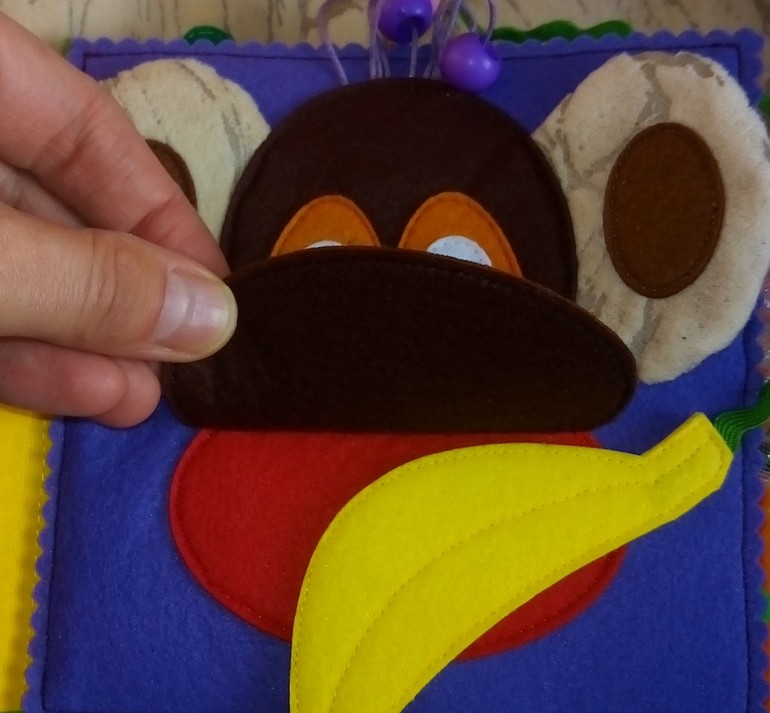 Жираф Аркаша - шея жирафа, это застежка для минибука, она на магнитной кнопке и резинке и если потянуть, то шея Аркаши становится ещё длиннее, также можно потрогать рожки и хвостик, и сравнить шея - длинная, а хвостик - короткий. Здесь же тренировка вклыдывания деталей в кармашек.