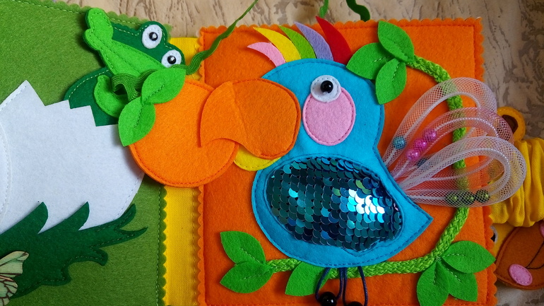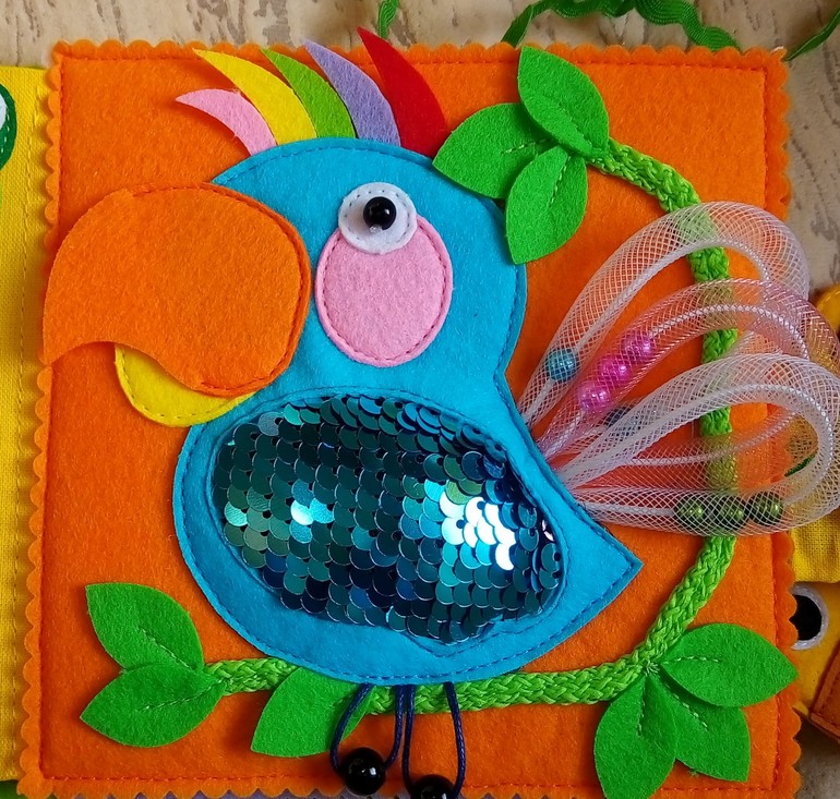 Тактильные элементы : хохолок на голове, крыло с двухсторонними пайетками, ножки-бусины, хвост бусины на шнурке в ювелирной трубке(регилин). В клюв попугая так же можно вложить фрукт.