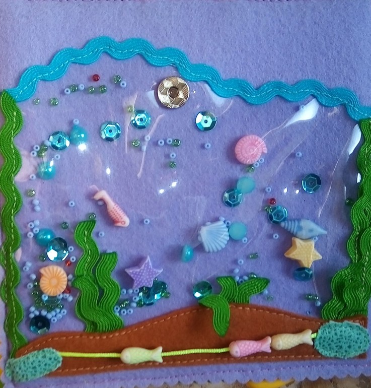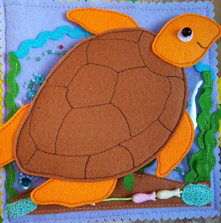 Черепаха на магнитной кнопке, съемная. Внизу плавают рыбки, перебираем пальчиками