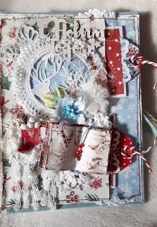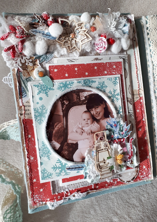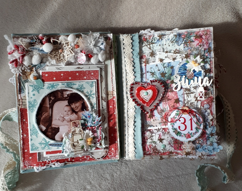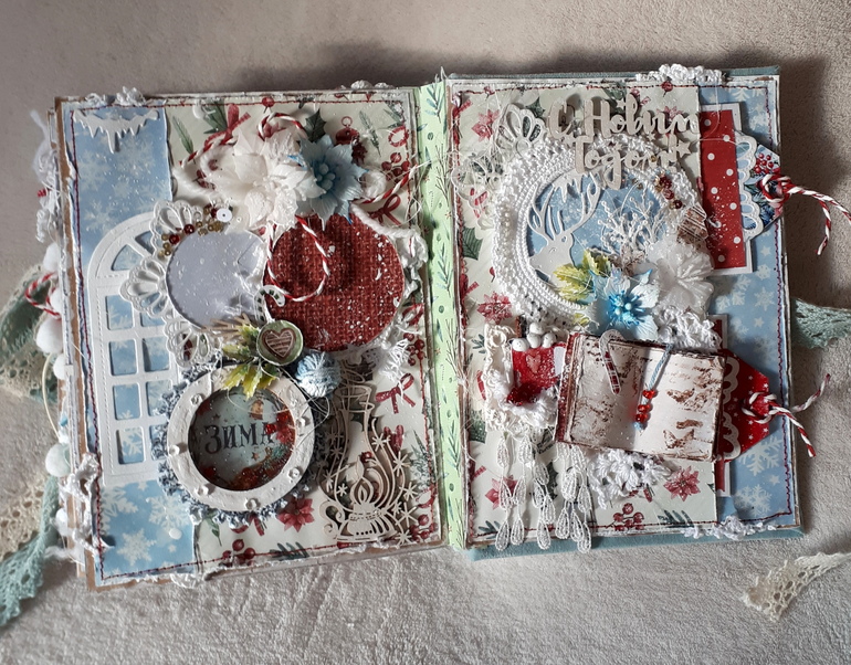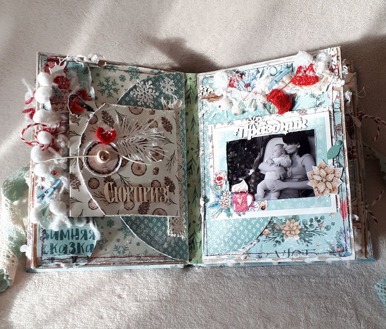 Альбом вмещает около 35 маленьких фото, так же есть кармашки для хранения пожеланий, билетиков с елок. В альбоме есть поп-ап конструкции, множество интересных деталей.