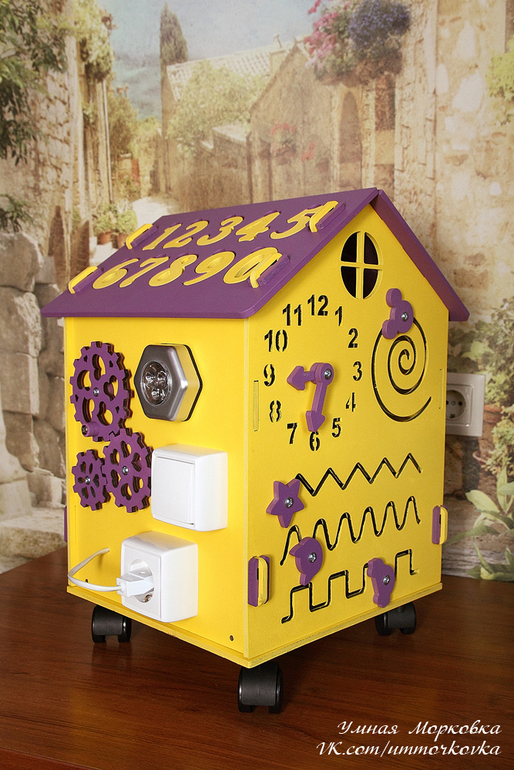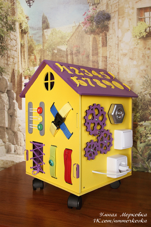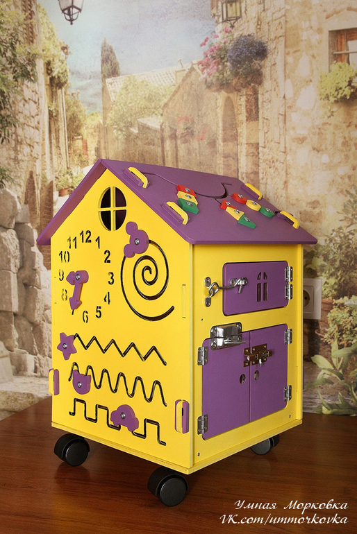 Итак бизидомик. Размеры 30х30х46см. Изготовлен из 6мм фанеры. Имеет 6 игровых сторон.