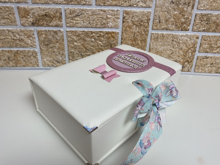 Шкатулка для хранения памятных вещей малышки, выполнена из экокожи, имеется 4 коробочки, рамка для 3-х фото. Коробочки удобно вытаскиваются с помощью ленты.