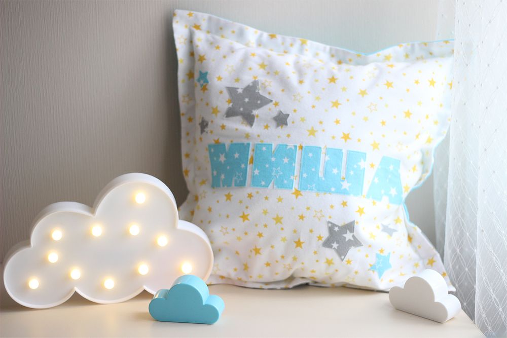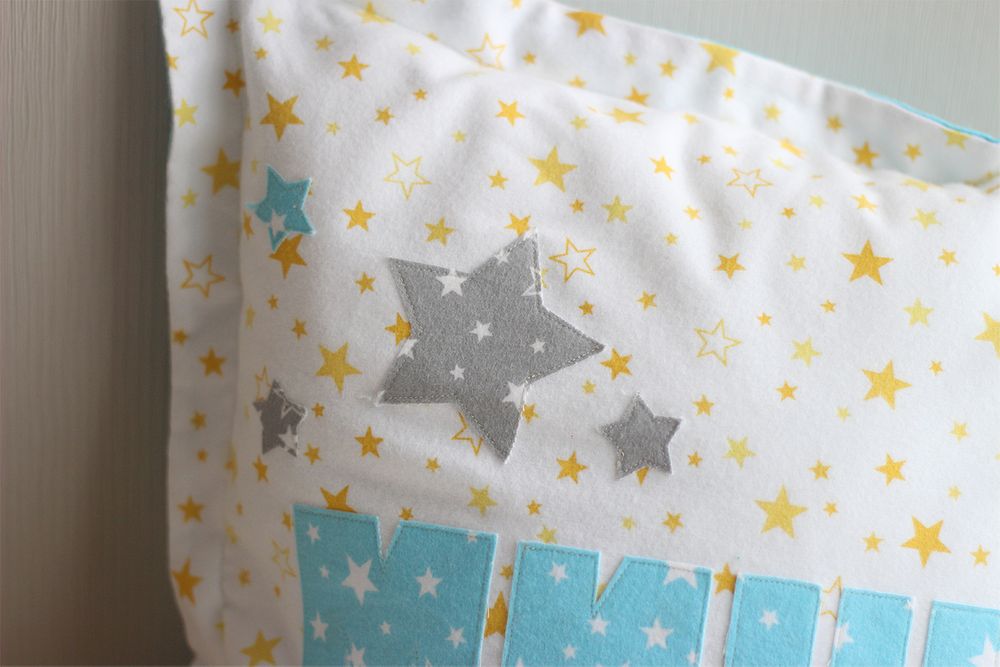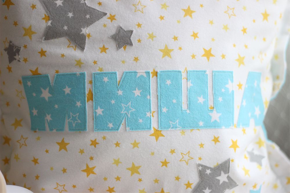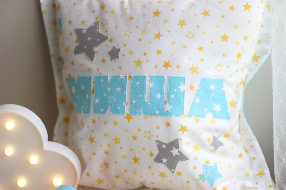 ПэчворкСошью на заказ наволочку с именем ребенка. Имя до 6 букв + 3 декоративных элемента - бесплатно. Дальше - 50 руб/буква, 30 руб большой элемент, 20 руб - маленький. Ткани: хлопковая фланель, американский 100% хлопок на выбор. Ваши размеры.