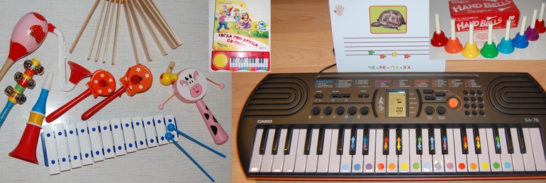 Всегда хотела, что бы у каждого ребенка был опыт во всех направлениях, в том числе и по музыке. Все знают, что еще в животике у мамы, малыш уже реагирует на музыку. Мне было сложно подбирать пособия, т.к. в детстве "медведь на ухо наступил", поэтому ни слуха ни голоса нет. Но по отзывам, мнению мужа с отличным слухом и голосом и личному видению у нас появились пособия и дом наполнился музыкой. Тут покажу только самые удачные и полюбившиеся материалы.